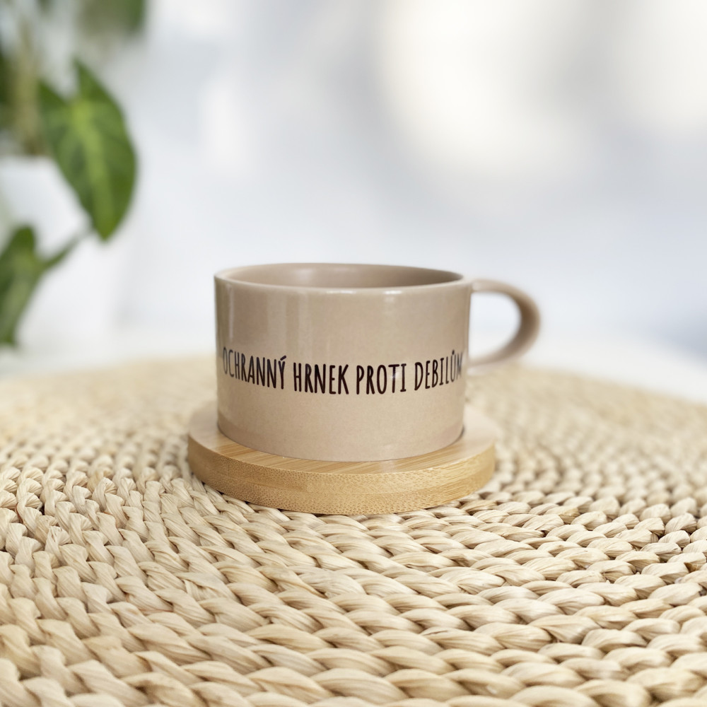 Designový keramický hrnek a dřevěný talířek v moderní přírodní barvě (bambus).