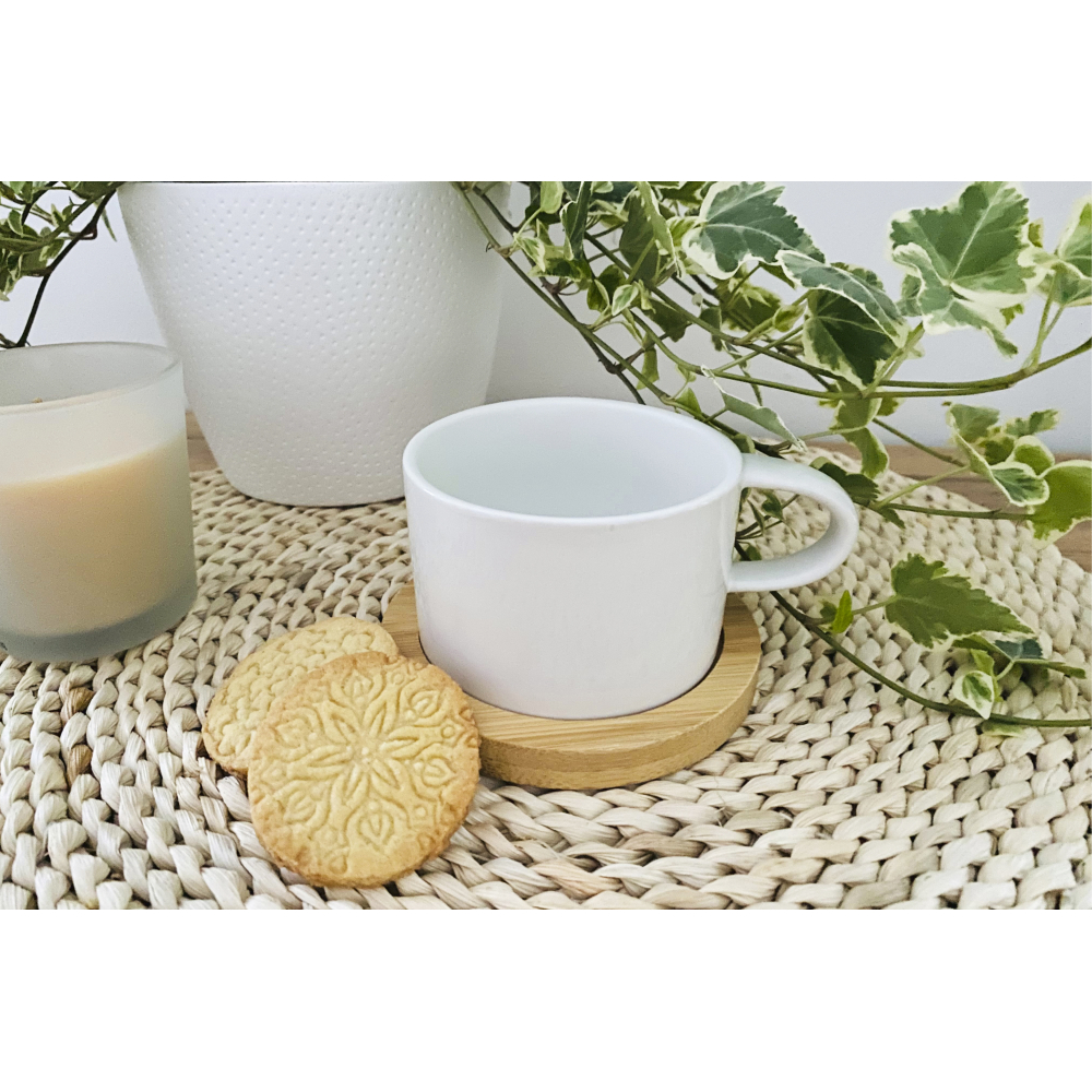 Designový keramický hrnek a dřevěný talířek v moderní přírodní barvě (bambus).