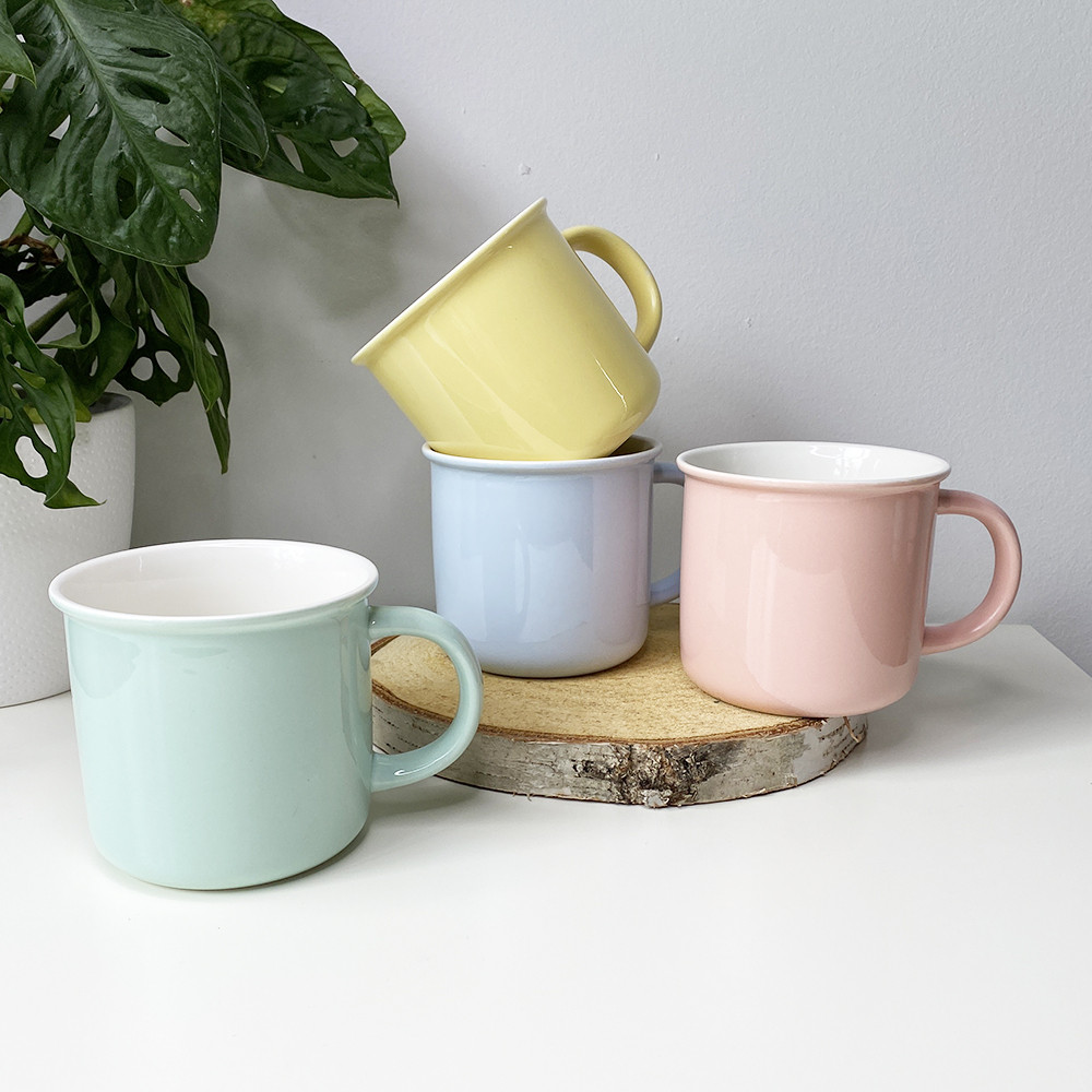 Hrnek je dostupný ve čtyřech jemných pastelových barvách - světle růžové, žluté, modré a zelené.
